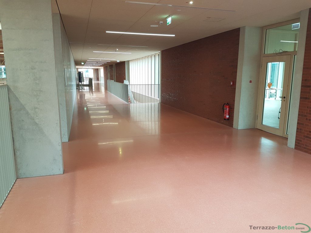 Unsere Leistung an der Grundschule in Darmstadt: 1.500 m² Terrazzoboden als Gussterrazzo und 2 Stck. selbsttrangende Terrazzoholmtreppen mit je einem Zwischenpodoest und je einem Austrittpodest.