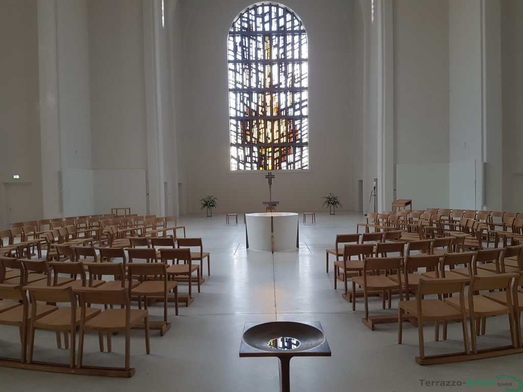Unsere Leistung: 1.000 m² hubsteigerbefahrbarer Terrrazzoboden als Gussterrazzo, 20 m Terrazzostufen, 50 Stck. Terrazzowangenstufen, 1 Altar aus Terrazzobeton.