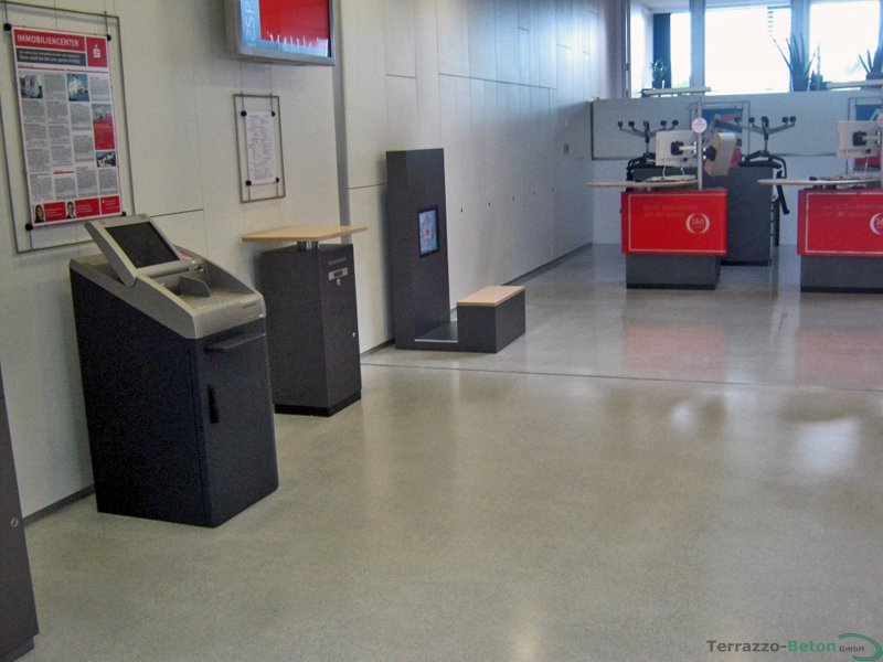 In der Kreissparkasse in Marbach am Neckar wurden 350 m² Terrrazzoboden als Gussterrazzo und 150 m Terrazzostufen verarbeitet.