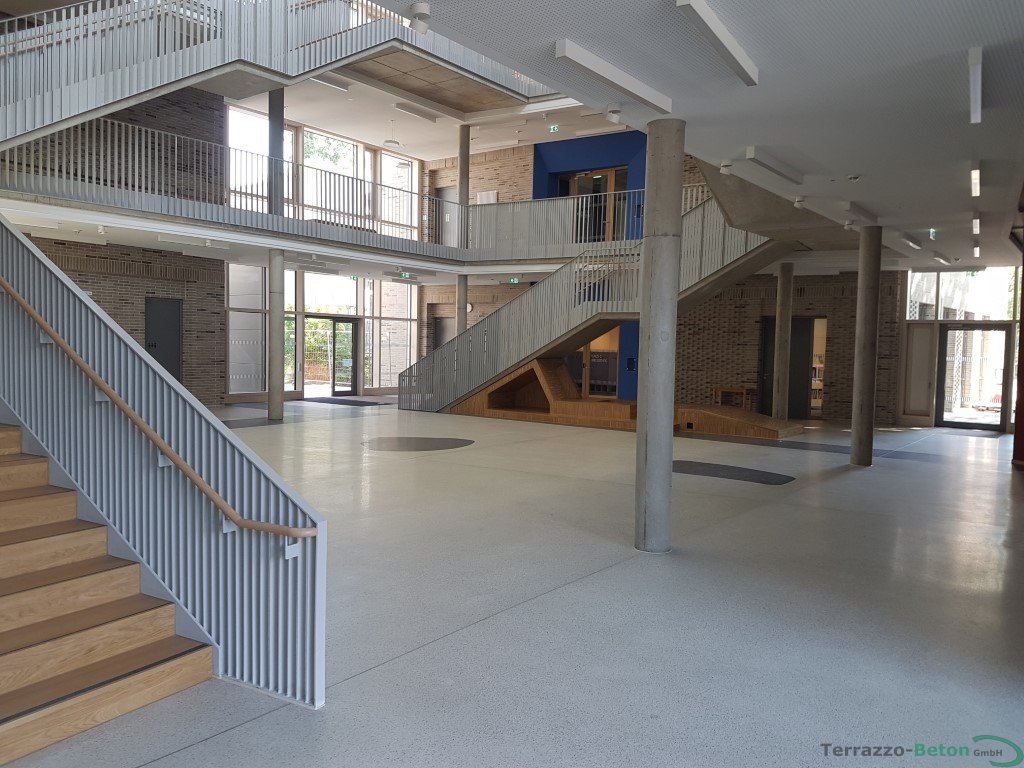 Unsere Leistung an der Römerstadtschule in Frankfurt: 700 m² hubsteigerbefahrbarer Terrazzoboden als Gussterrazzo, 2 Intarsien aus Terrazzobeton mit Glaszuschlägen und 100 m Terrazzobetonfries.