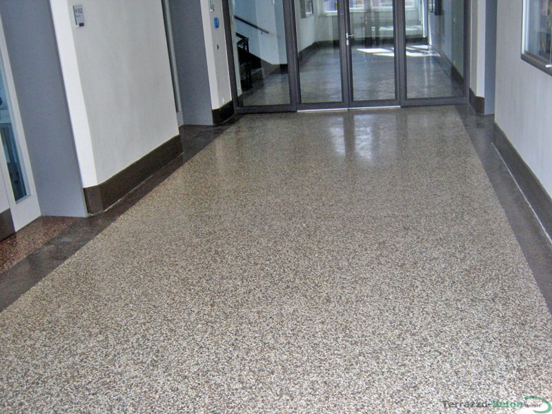 Bei der Sanierung der Albert-Schweitzer-Schule in Kassel verarbeiteten wir 50 m² Terrazzoboden als Walzterrazzo, 1 Intarsie mit Moaiksteinchen und haben 200 m² Bestandsterrazzo aufgearbeitet.
